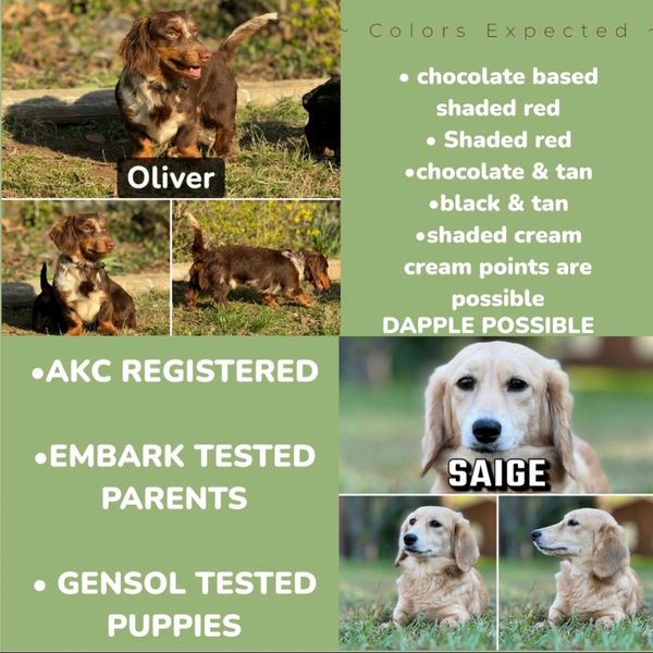 Saige & Oliver are in hopes for a gorgeous litter soon! See the picture for expected colors & patterns!